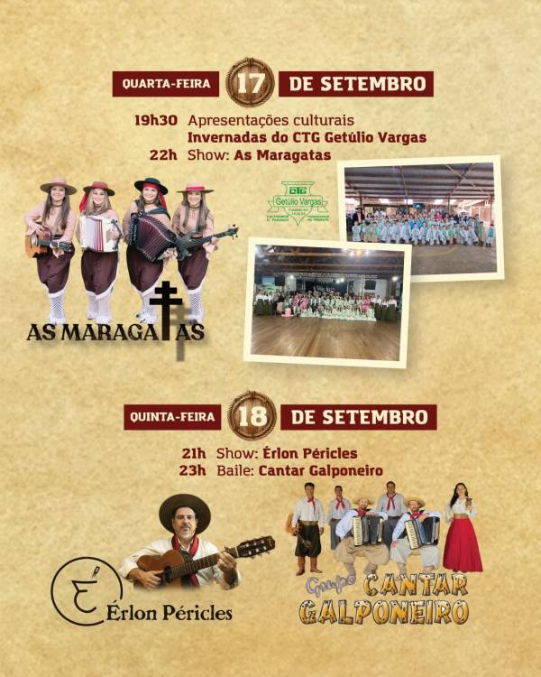19h30 – Apresentações culturais – Invernada do CTG Getúlio Vargas